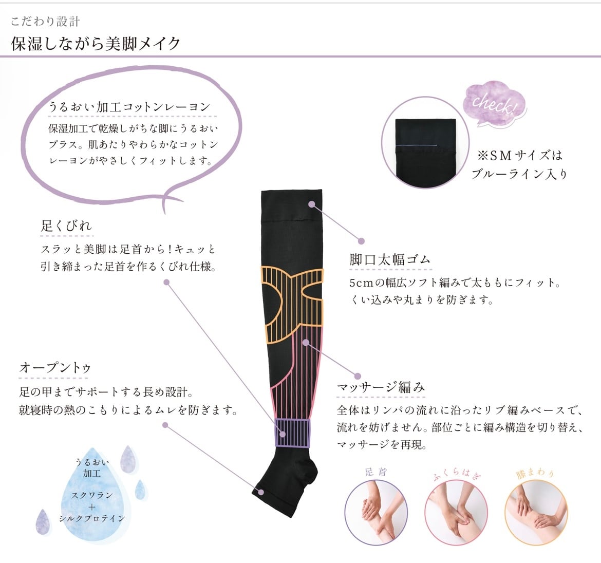 保湿加工で乾燥しがちな脚にうるおいプラス。肌あたりやわらかなコットン