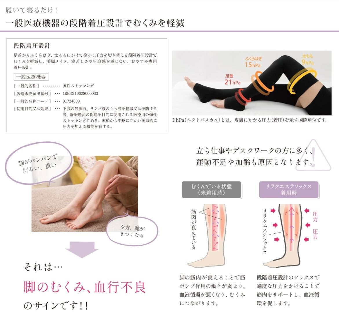 足首からふくらはぎ、太ももにかけて、徐々に圧力を切り替える段階着圧設計で、むくみを軽減し、美脚メイク。寝苦しさや圧迫感を感じない、おやすみ専用着圧設計。
